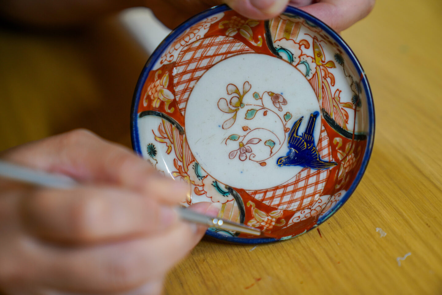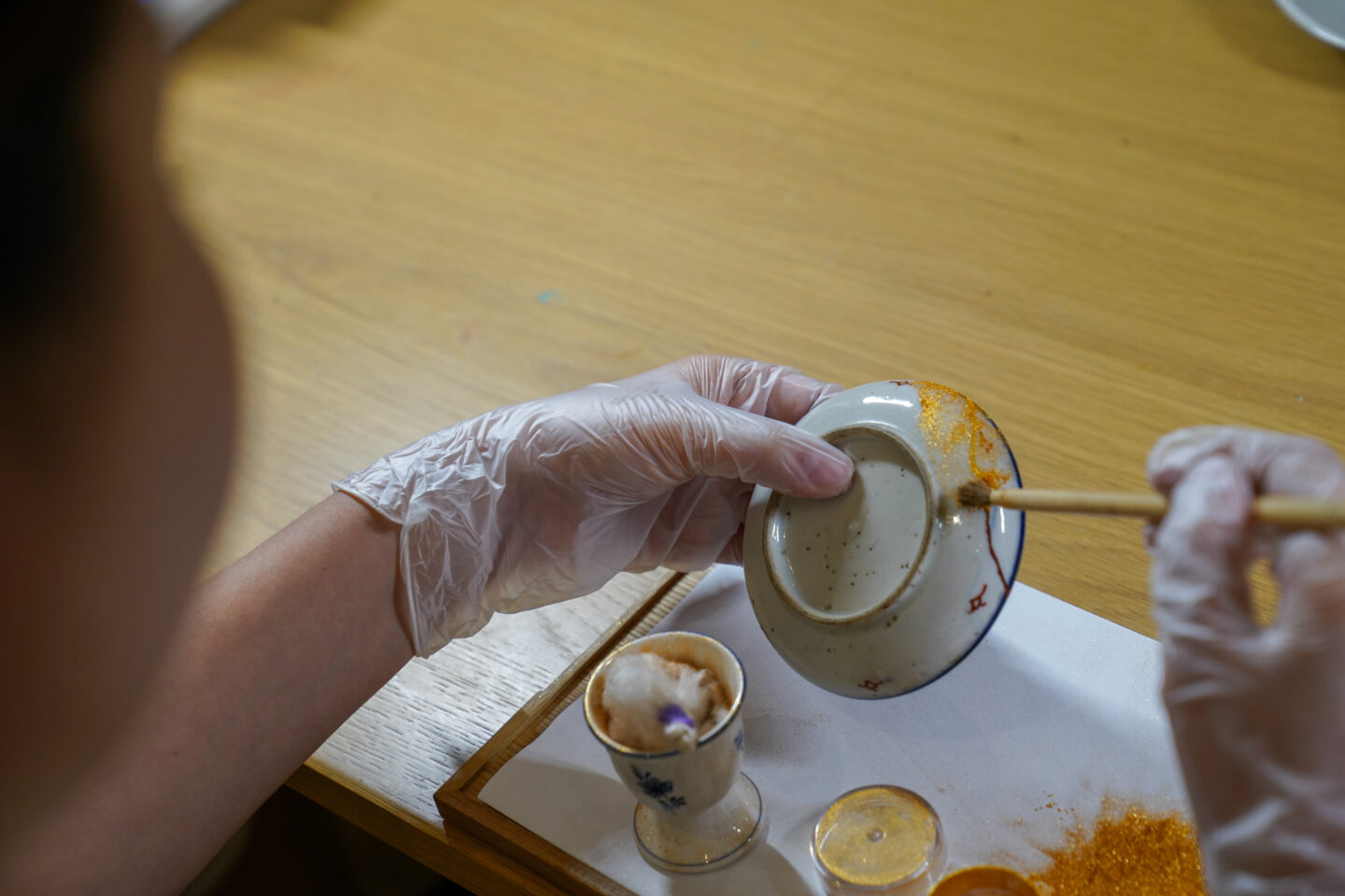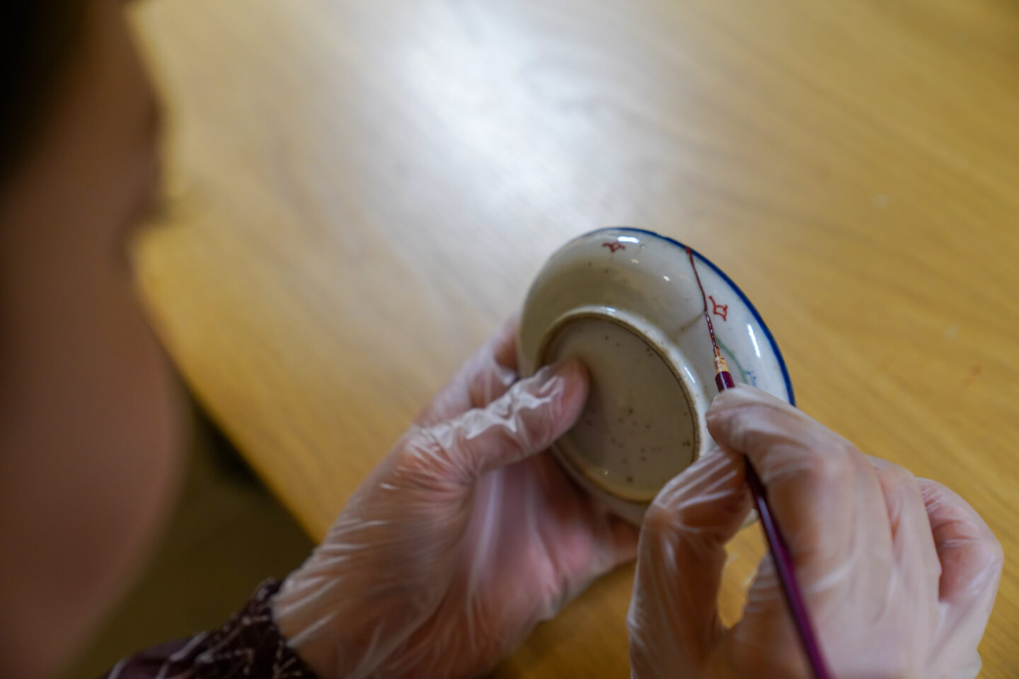 ※修繕工程で本漆を使用するため、体質により皮膚がかぶれる場合がございます。工房ではエプロン・手袋・腕カバーをご用意し、漆が皮膚に付着しないようご案内いたしますが、かぶれないことを保証するものではございません。あらかじめご了承ください。
