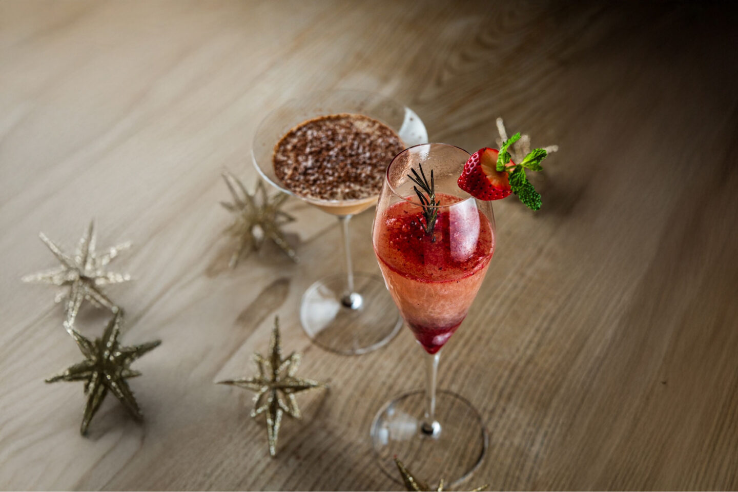 華やかなホリデーシーズンを彩る、期間限定のクリスマスカクテルを2種類ご用意いたしました。チョコレートとエスプレッソが織りなす大人のロマンティックな味わい「セレナーデ」、そしてシャンパンのきらめきとラズベリーの鮮やかな彩りで聖夜を表現した「スレイベル」。特別な夜にふさわしい、華やかで上質なカクテルをお楽しみください。